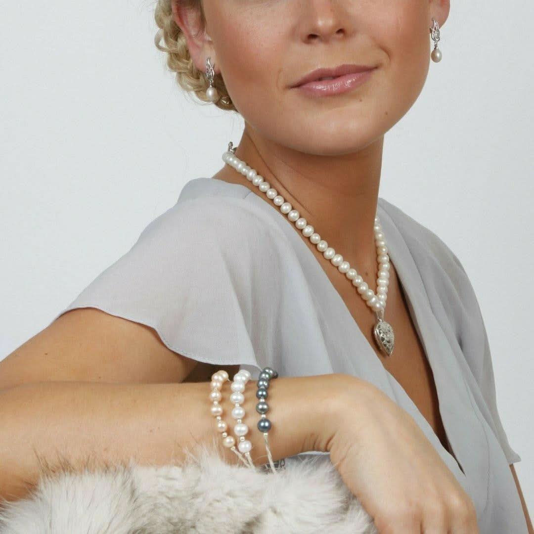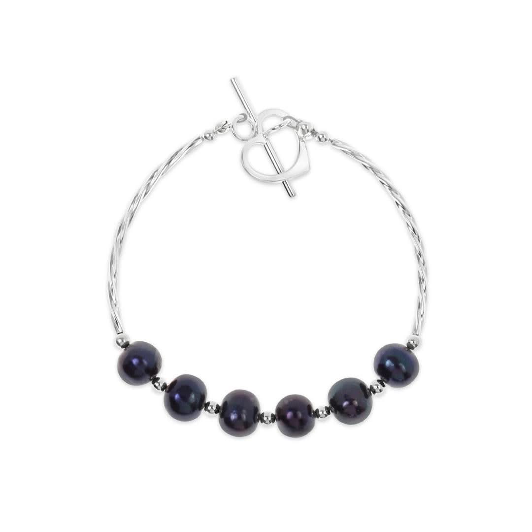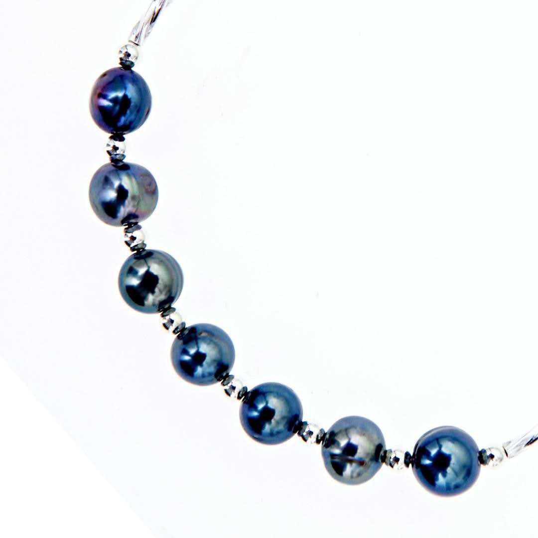 Midnight blue freshwater pearls combine with twisted silver ropes and a silver heart clasp to form a pretty and wearable bracelet. Wear them singly, in twos or threes, or layer them with Lily Blanche Classic or Sterling Pearl bracelets for a great effect. We use undyed, freshwater, cultured pearls from a sustainable source. Matching necklace and earrings available. Also available in ivory and champagne pink. Bracelet length: 7.5 inches/19cm.