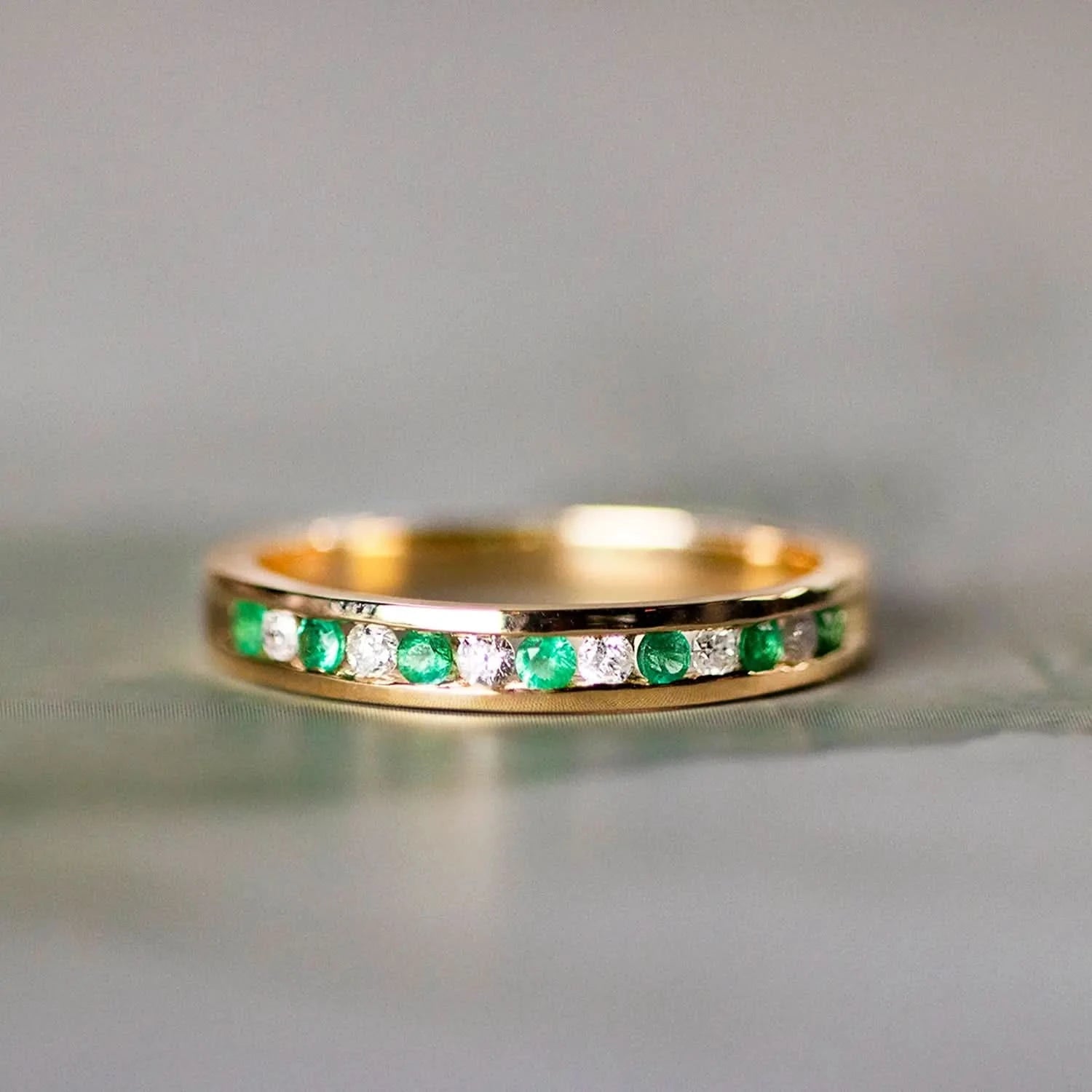 This elegant half-eternity ring is not only a luxurious statement piece but also a meaningful symbol of love and commitment. The blend of emeralds and diamonds makes it perfect for May birthdays, anniversaries, or any special occasion. With its classic design and superior craftsmanship, this ring will be a cherished heirloom for years to come.