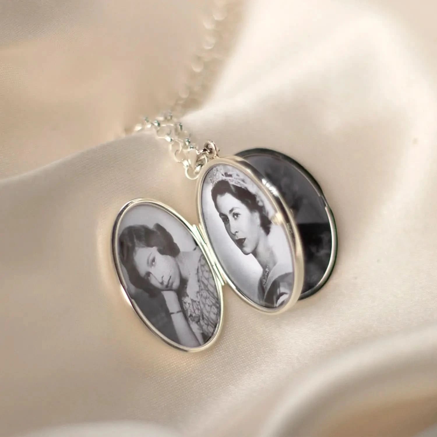 Handcrafted in the UK by master silversmiths, the Queen Elizabeth Locket is an amazing, four photo locket handcrafted by master silversmiths. This heritage locket opens like a book to show four of your favourite photos. This large statement locket can be engraved on the front. Personalise the locket with your own choice of images. (Images of the Queen are for display purposes only.)