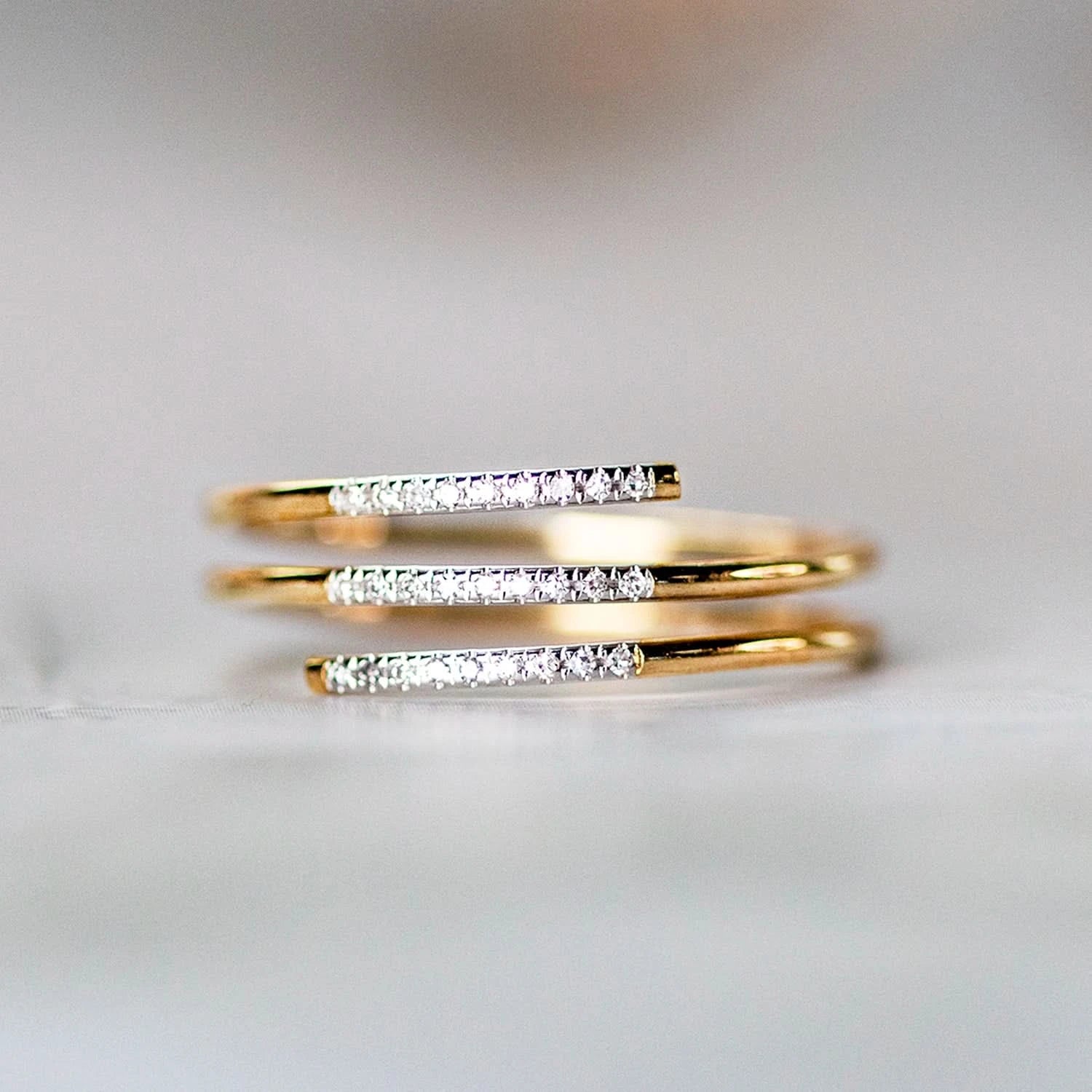 Our Solid Gold Diamond Spiral Ring is beautifully crafted in 9-carat gold. This triple spiral ring features 27 precision-set natural white diamonds, 9 on each band of the coil. A modern classic, this diamond ring is dainty enough for stacking buta statement piece when worn singly. With its fusion of classic diamonds and modern design, this ring makes a welcome addition to any jewellery collection.