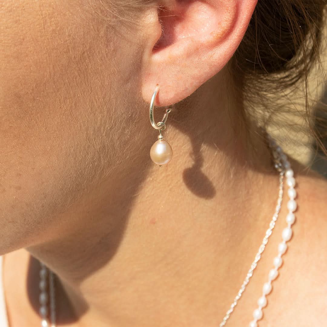 Our Teardrop Pearl Hoop Earrings are our modern take on the classic pearl earring. These stunning sterling silver hoop earrings feature a freshwater pear-shaped champagne pink pearl, the birthstone for June. The pearls are detachable and interchangable so you can wear the hoops on their own, with the pearls or add a different gemstone from our birthstone collection for a truly versatile look.