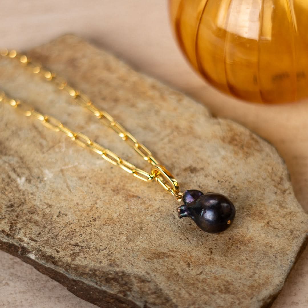 Our Black Baroque Pearl Paperclip Necklace is hand-crafted in our studio from the finest quality materials. The necklace features a real, lustrous, naturally shaped pearl. The birthstone for June, the baroque pearl's unique shape and character, make each necklace one-of-a-kind, creating a sophisticated statement necklace.