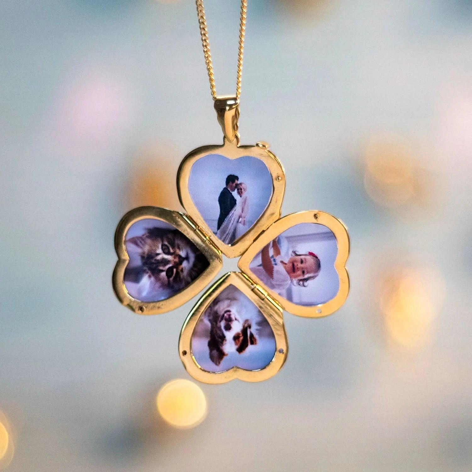 This four picture heart locket opens out in a shamrock shape to reveal four hidden pictures. The locket is made of 18 carat gold vermeil and is hallmarked by the Assay office with a full UK hallmark.This heart locket can be personalised with photos and engraving. This slimline, locket necklace is a perfect family locket and makes and ideal Christmas or anniversary gift. An 18 inch or 24 inch curb chain is included in the price.